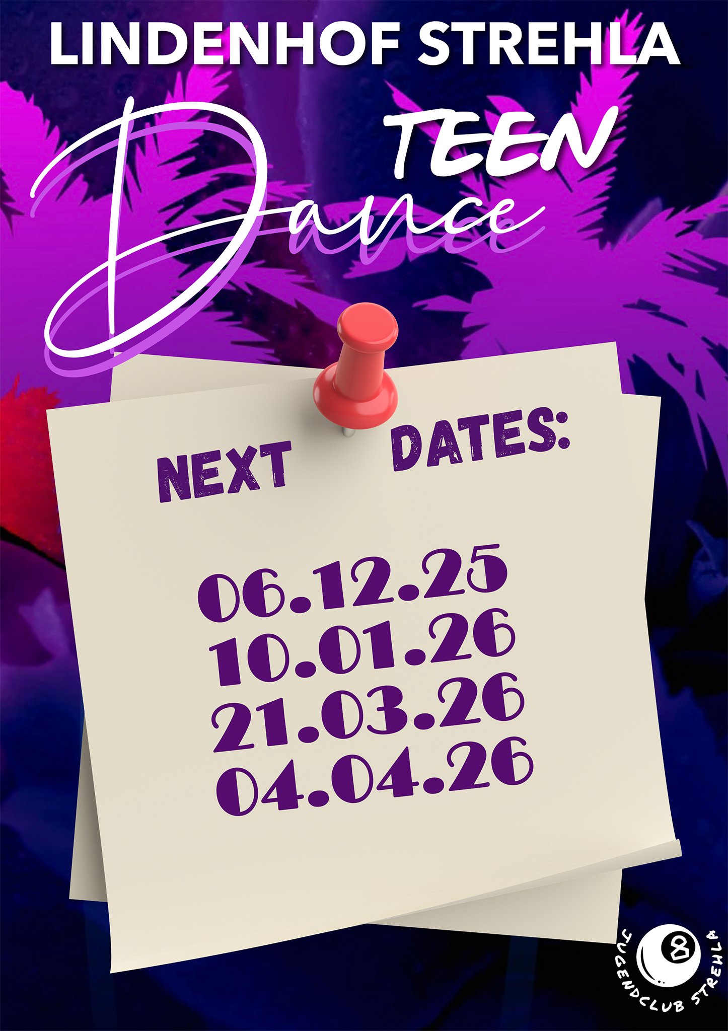 Jetzt seid ihr dran! Die große Teenie Party für alle im Alter von 11-16 Jahren. Von den aktuellen Charts bis hin zu den angesagtesten Club Sounds feierst du mit uns im Lindenhof Strehla.
